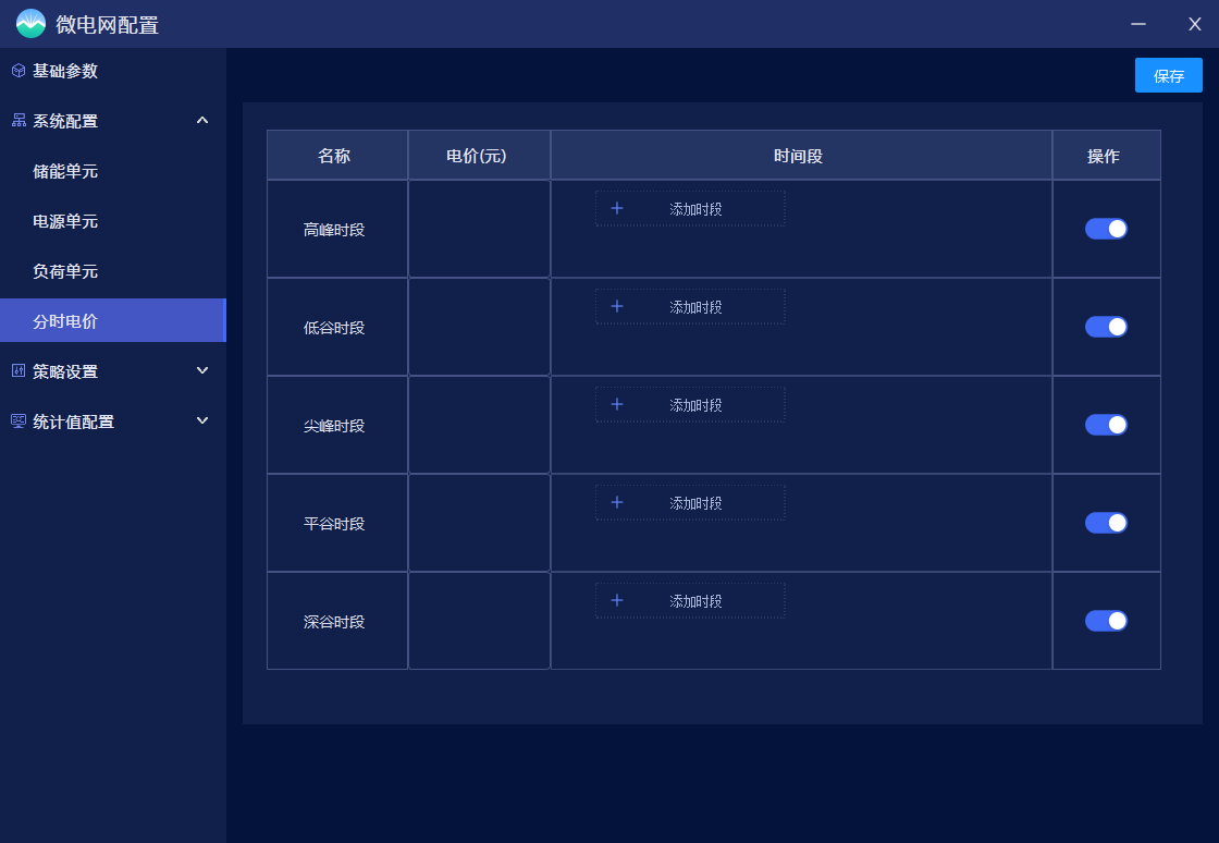 满足储能系统设备参数的配置、电价参数与时段的设置、控制策略的选择。目前支持的控制策略包含计划曲线、削峰填谷、需量控制等。