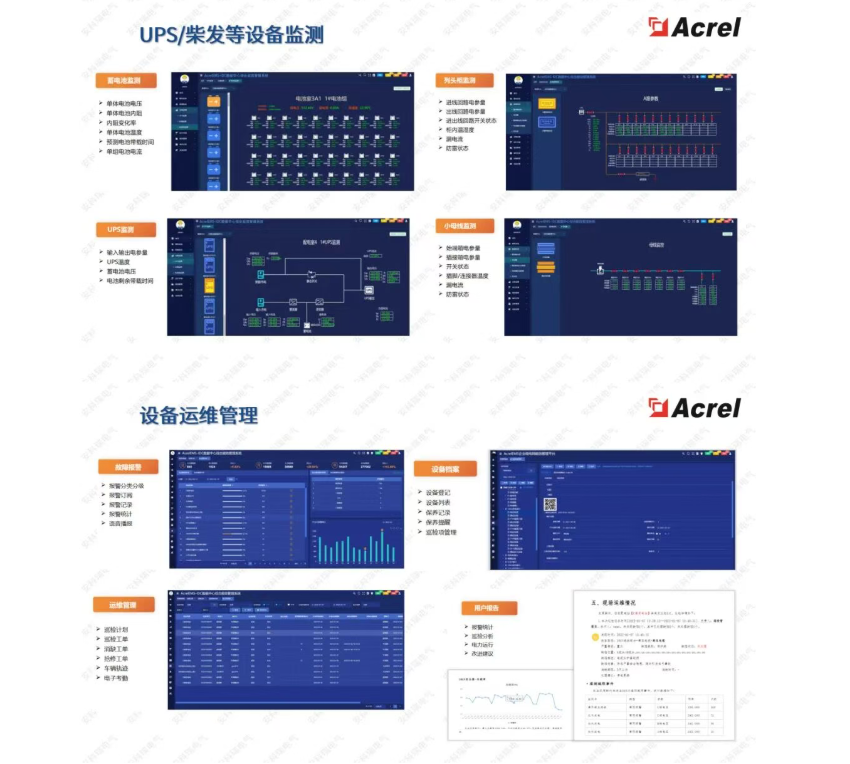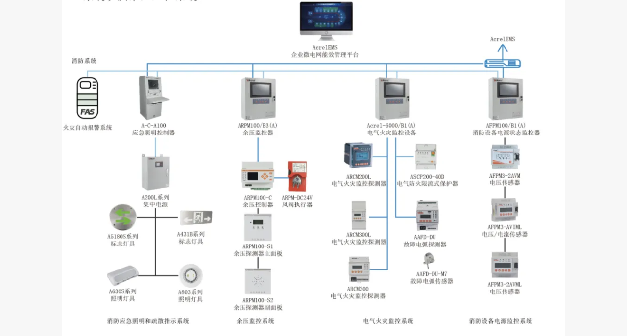 构建完善的数据中心计量体系,精准统计IT设备、制冷设备、照明系统、办公系统等各环节的能耗数据,实时计算数据中心PUE值,为能效优化提供数据支撑,助力数据中心向PUE1.5以下的行业目标迈进。同时,强化安全用电分析,AcrelEMS系统可便捷接入电气火灾监控系统、消防设备电源监控系统、防火门监控系统、消防应急照明和疏散指示系统,各子系统严格按照国家标准建设,其调试记录、拓扑结构、运行数据、故障报警等信息可自动上传至平台,实现电气安全与消防系统的集中监控、统一管理,规避用电安全风险。