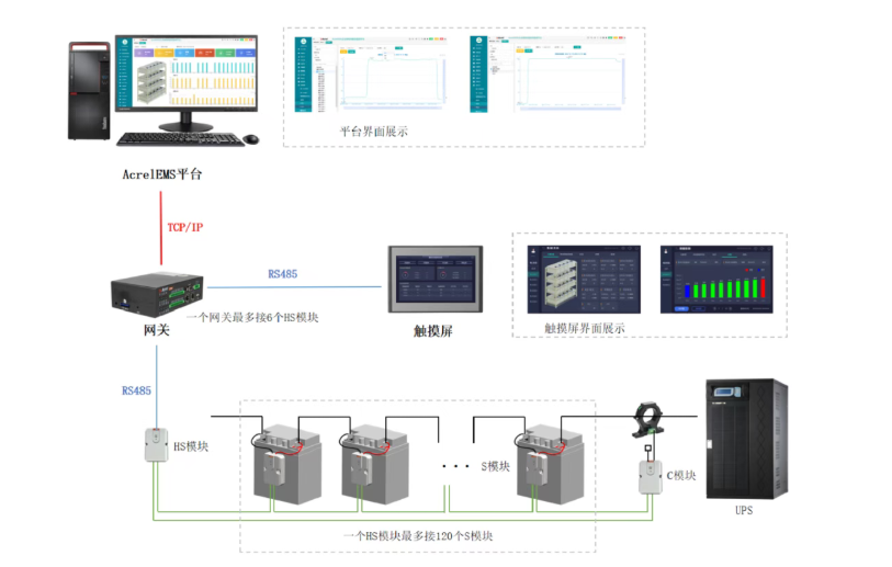 采用ABAT100蓄电池在线监测产品,全面监测电池电压、内阻、内部温度、SOC(剩余容量)、SOH(健康状态)等核心参数,可提前对失效电池发出预警,有效保障电池组备电时长,规避供电中断风险。该系统由ABAT100-S单体电池监测模块、ABAT100-C单组电池监测模块、ABAT100-HS采集器模块及触摸屏组成,工作人员可通过触摸屏查询告警信息、实时数据及设置参数,也可通过监测平台实现集中管理,确保UPS系统稳定运行。
